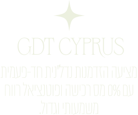 GDT CYPRUS היא חברה צעירה ודינמית, המתמחה בשיווק ובקידום פרויקטים נדל"ניים בקפריסין ובישראל. עם צוות מקצועי בעל ניסיון רב והיכרות עמוקה עם השוק המקומי והבינלאומי, החברה מציעה ללקוחותיה מעטפת שירות מלאה – משלב הייעוץ הראשוני ועד למציאת ההשקעה המתאימה ביותר. החברה פועלת על פי ערכי מצוינות, אמינות ואיכות, ומקפידה ללוות כל לקוח באופן אישי ומקצועי. החזון של GDT CYPRUS הוא ליצור חוויית השקעה בטוחה ורווחית, תוך מתן ערך אמיתי ושקיפות מלאה לאורך כל הדרך.